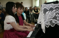 演奏会では、「ふるさと」や「上を向いて歩こう」、「リンゴ追分」、「小犬のワルツ」など8曲を連弾で披露。お年寄りらは、一緒に手拍子を打ったり歌を口ずさむなど楽しそうな様子だった。